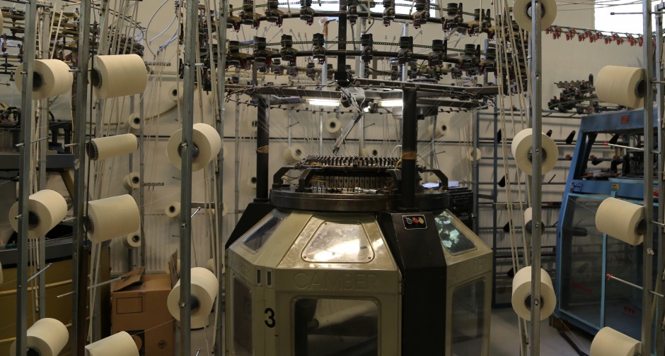 A circular knitting machine has a machine cylinder (where the needles are bedded) witch rotates around feeding the yarn to the needles and thus produces tubular knitted fabric. The diameter of the cylinder varies according to the needs. This machine is owned by one of the few remaining knitting factories in Finland in Kangasala, Neuletuote Koivunen Oy. The factory is privately owned and there is only one employee.