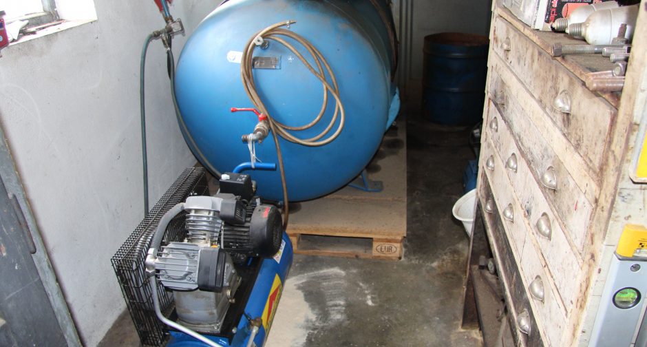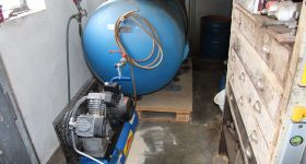 The staple gun is powered by compressed air supplied by the compressor via a hose. The industrial piston compressor is connected to an air receiver tank.