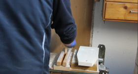 In the sixth step of assembling this wooden box, the milling machine is used to smooth the freshly cut edges from the previous step. Since the cut was made at an angle and therefore against the wood’s natural grain, the edges need to be smoothed to prevent splinters and achieve a cleaner finish.